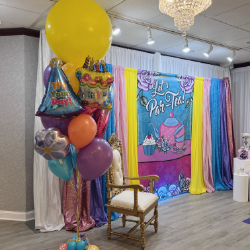 This upgrade takes place after the cake ceremony, during the gift-opening portion of the party. The Guest of Honor is seated on our ornate throne chair for a photo-worthy moment that feels celebratory and meaningful.